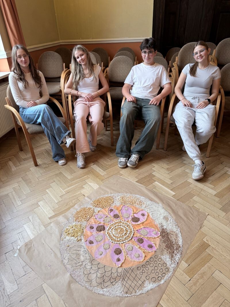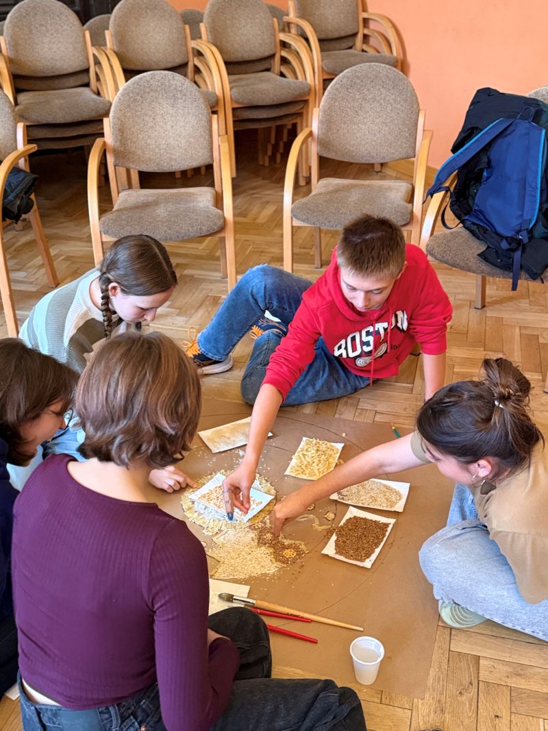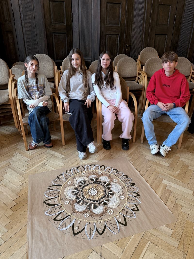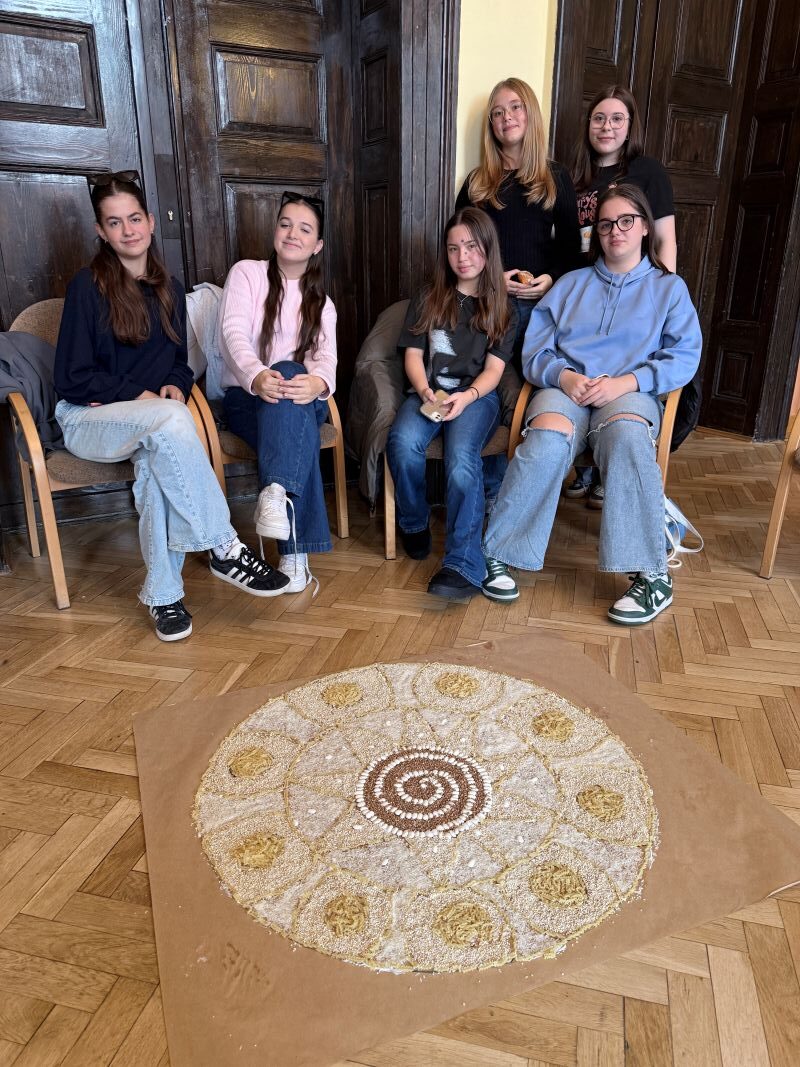 Uczniowie z Polski i Słowacji wzięli udział w warsztatach sensoplastyki, podczas których tworzyli kolorowe kompozycje z naturalnych materiałów – piasku, mąki, liści i przypraw. Powstałe prace, w tym wspólna mandala symbolizująca harmonię i współpracę, stały się nie tylko formą ekspresji, ale też okazją do rozmowy o tradycji i naturze w sztuce.