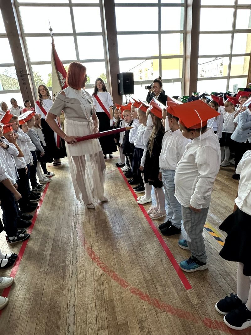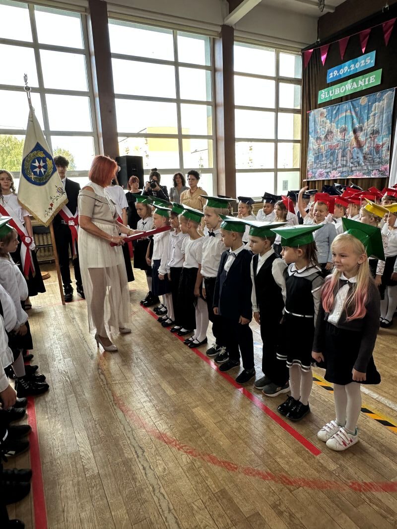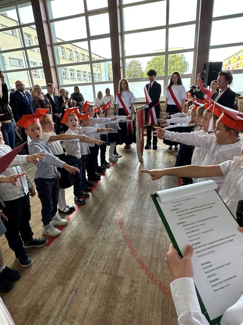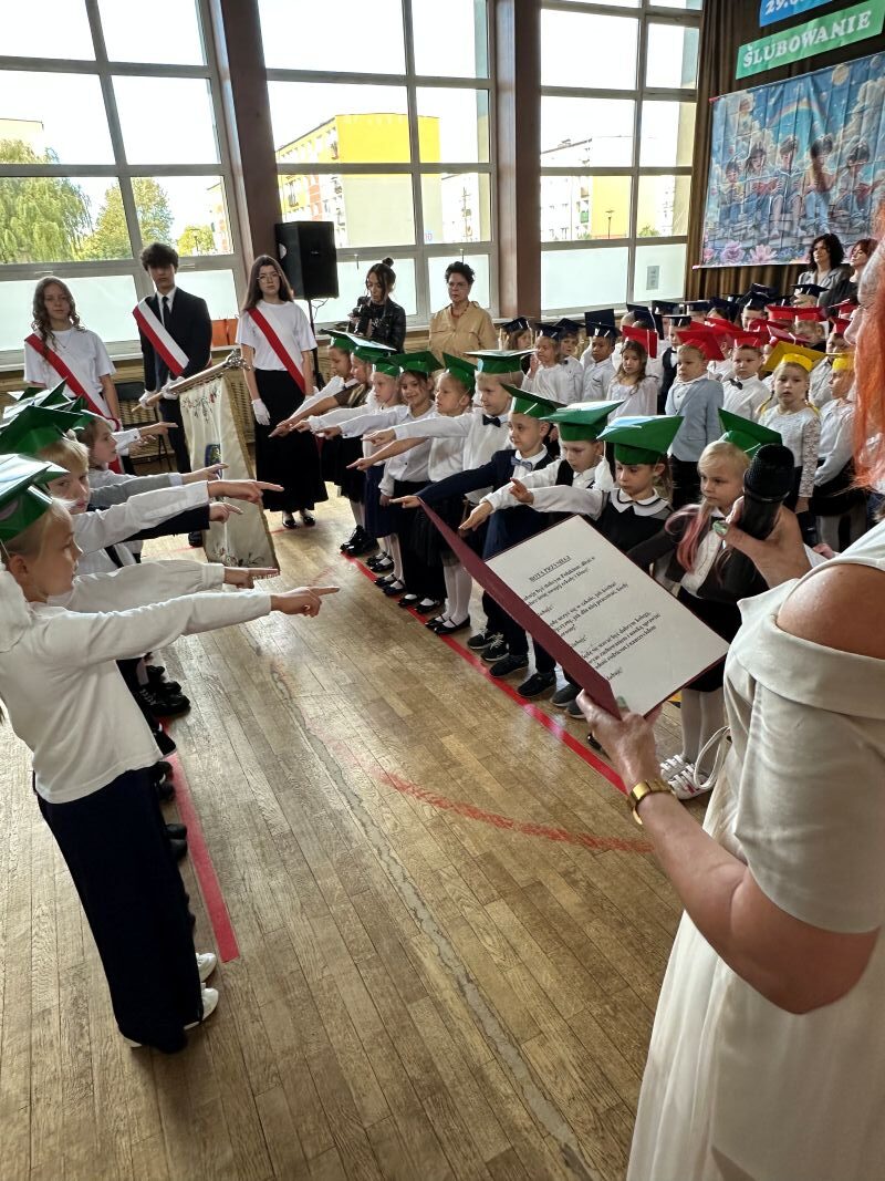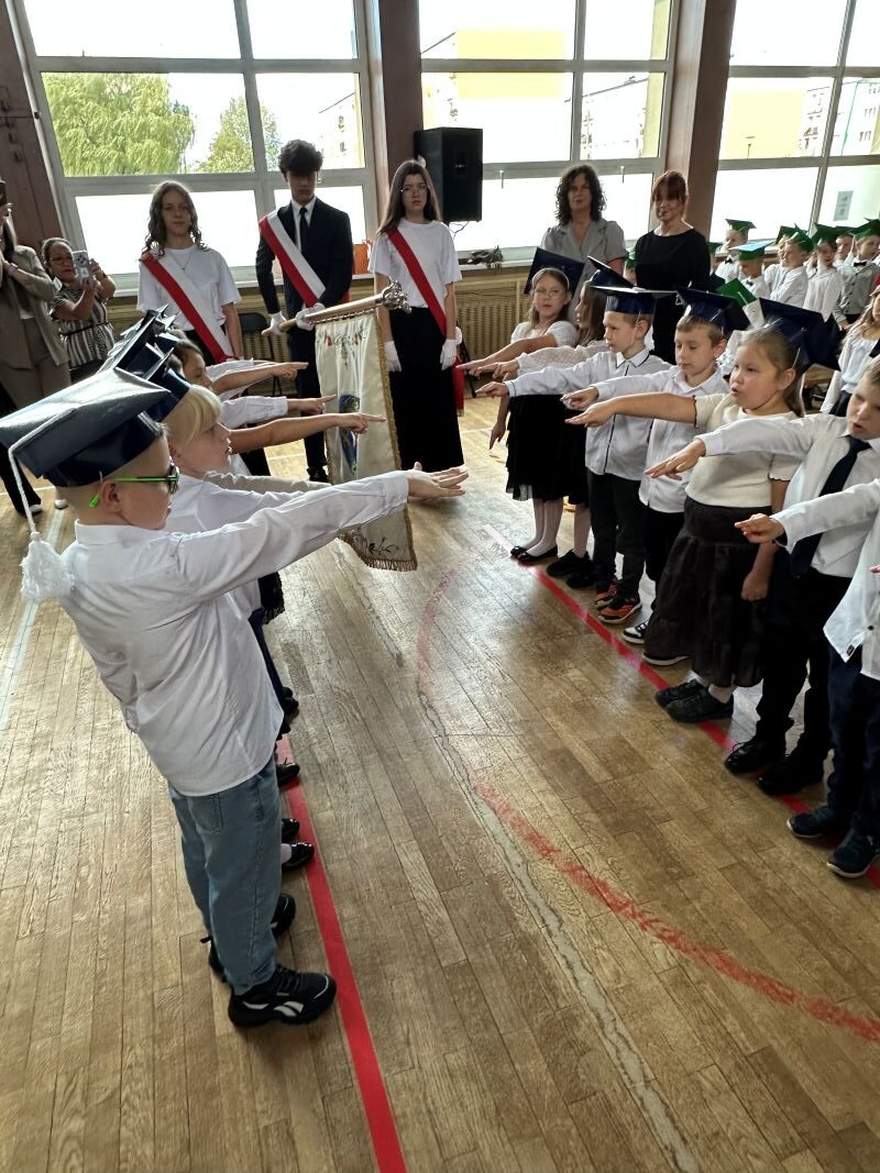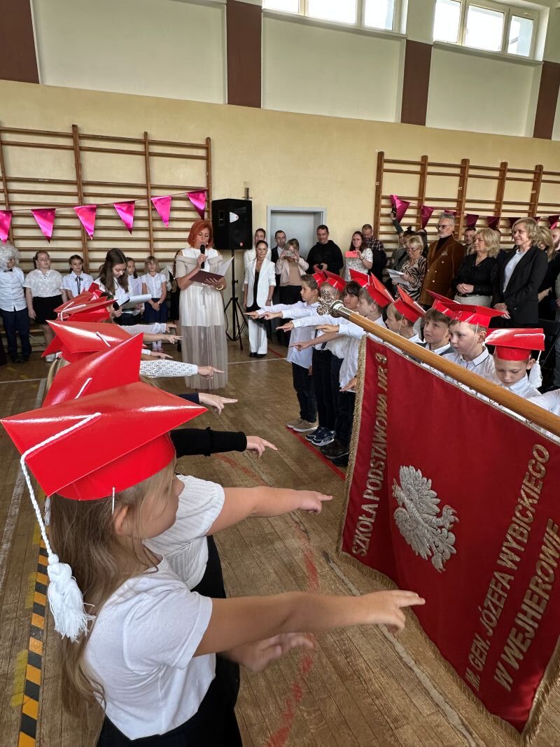 Najważniejszym momentem uroczystości było złożenie przez dzieci uroczystego ślubowania na sztandar szkoły oraz pasowanie na uczniów, którego dokonała pani Dyrektor Olga Tomaszewska. W ten sposób pierwszoklasiści zostali oficjalnie włączeni do grona uczniów Szkoły Podstawowej nr 9 im. gen. Józefa Wybickiego w Wejherowie.