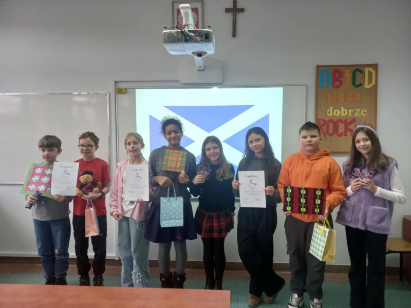 W ramach obchodów Dnia św. Andrzeja, patrona Szkocji, w naszej szkole odbył się konkurs dla klas piątych poświęcony kulturze i tradycjom szkockim. Jednym z głównych zadań było samodzielne zaprojektowanie i wykonanie przez uczniów własnego wzoru szkockiej kraty (tartanu). Dzieci wykazały się ogromną kreatywnością, a ich prace zachwyciły komisję pomysłowością i dbałością o szczegóły.