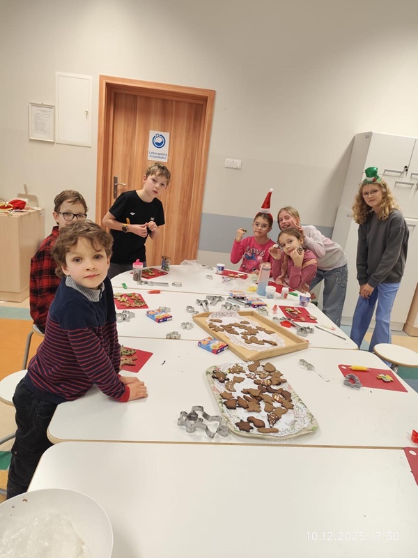 Nic tak nie nastraja świątecznie jak wspólne pieczenie pierników. W grudniowy wieczór, w gabinecie „Laboratoria przyszłości” zebrali się uczestnicy Wielkiego Maratonu Czytelniczego klas 3 i 5 wraz z paniami bibliotekarkami. Spotkanie zaczęło się od rozmowy na temat tradycji bożonarodzeniowych, w oparciu o literaturę świąteczną pochodzącą ze zbiorów naszej biblioteki. Dzieci poznały historię piernika. Dowiedziały się, jakich składników i przypraw używa się do nich wypieku, po czym z radością zabrały się za wałkowanie i wycinanie świątecznego ciasta. Pojawiły się ludziki, gwiazdki, serduszka i reniferki, które po upieczeniu udekorowano przeróżnymi wzorami. Powstały prawdziwe dzieła sztuki! Zajęcia przebiegły w miłej, przedświątecznej atmosferze, przy dźwiękach kolęd i pastorałek.