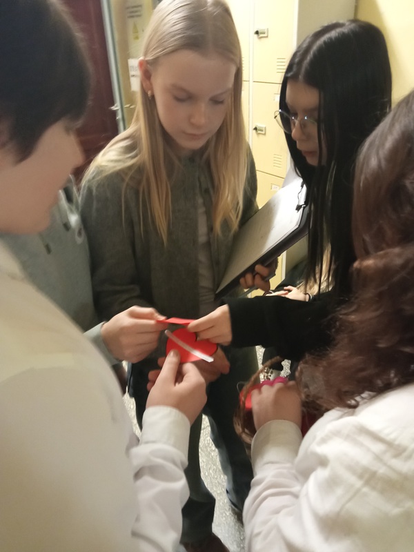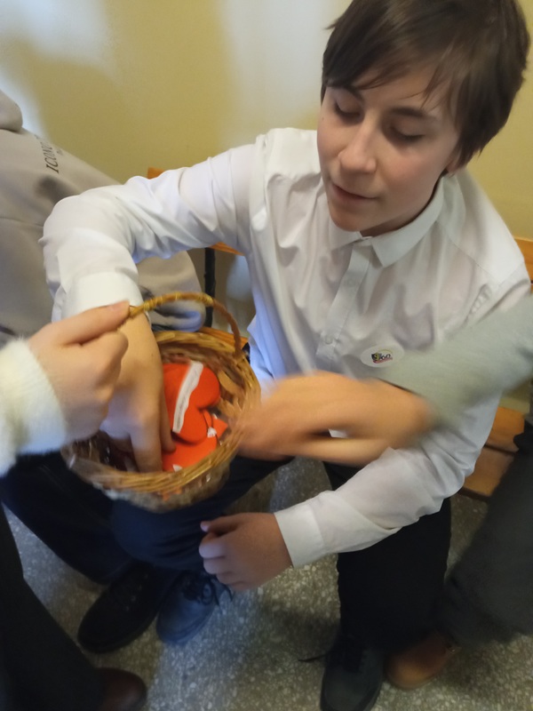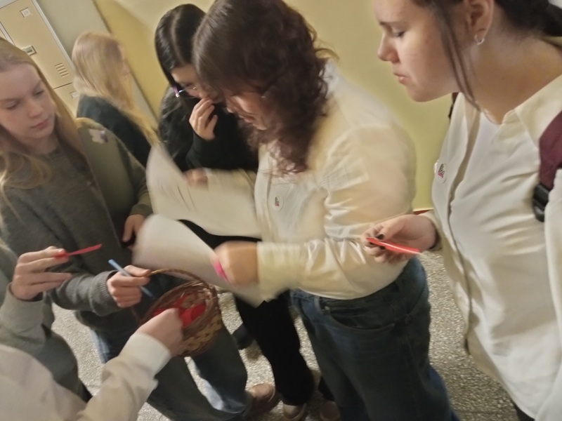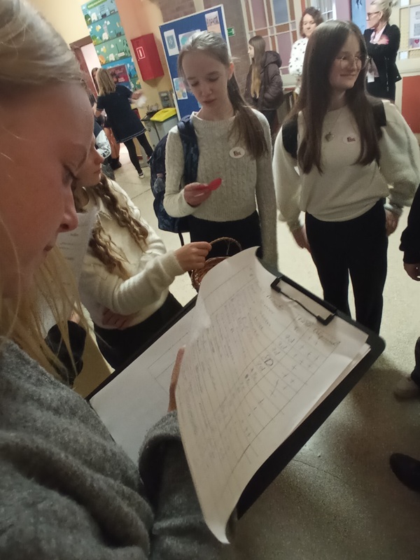 Podczas przerw po korytarzach spacerowały uczennice z koszyczkami pełnymi papierowych serduszek. Na każdym z nich znajdował się cytat o miłości pochodzący z jednej z lektur szkolnych. Zadaniem uczestników było odgadnięcie, z jakiej książki pochodzi wylosowany fragment.
