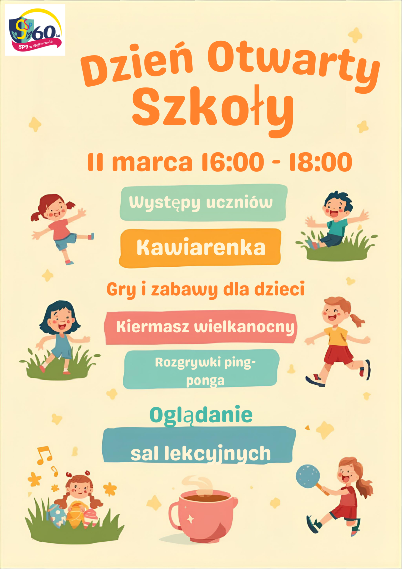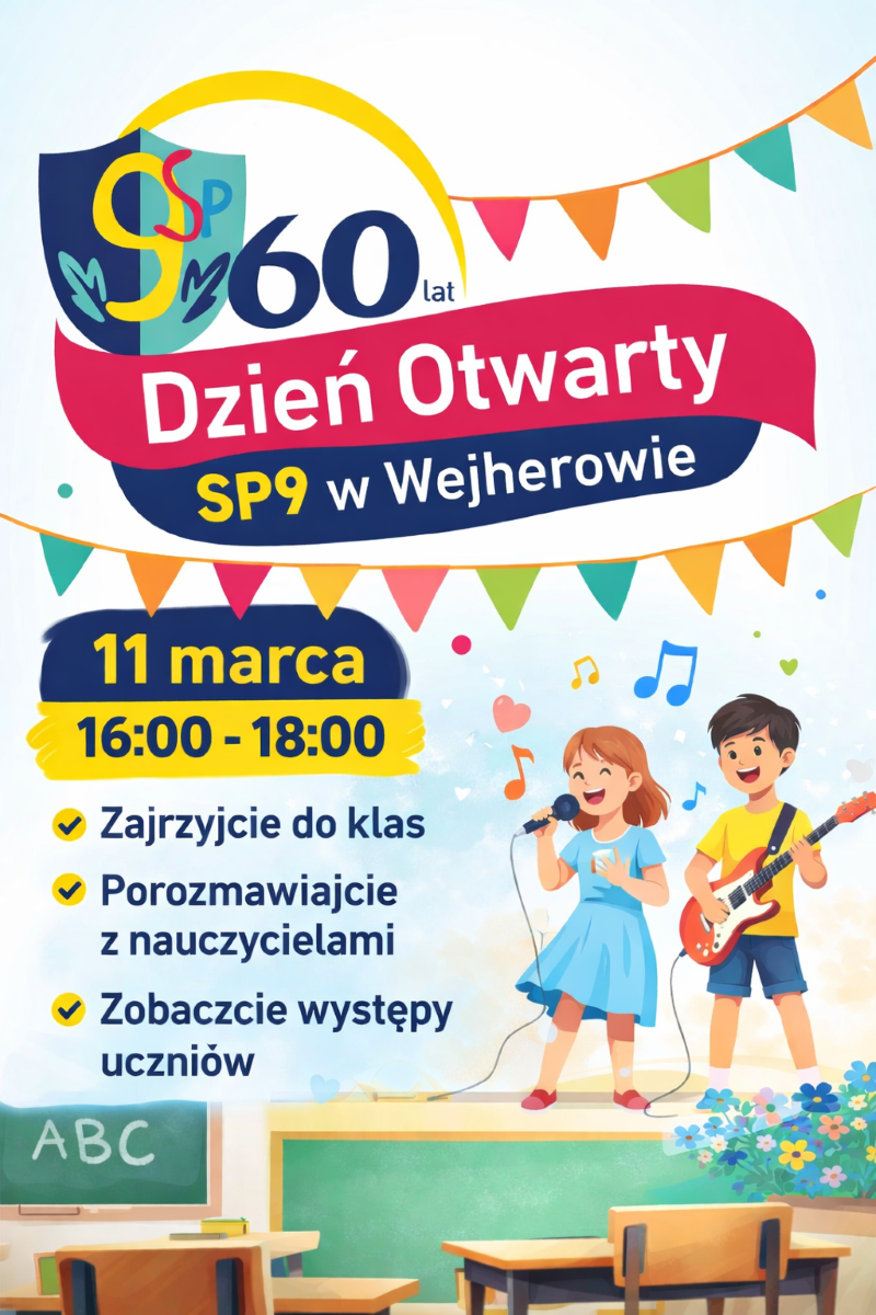 Serdecznie zapraszamy uczniów, rodziców oraz wszystkich zainteresowanych do udziału w Dniu Otwartym Szkoły Podstawowej nr 9 w Wejherowie. Będzie to doskonała okazja, aby poznać naszą szkołę, jej atmosferę oraz codzienne życie uczniów i nauczycieli.
